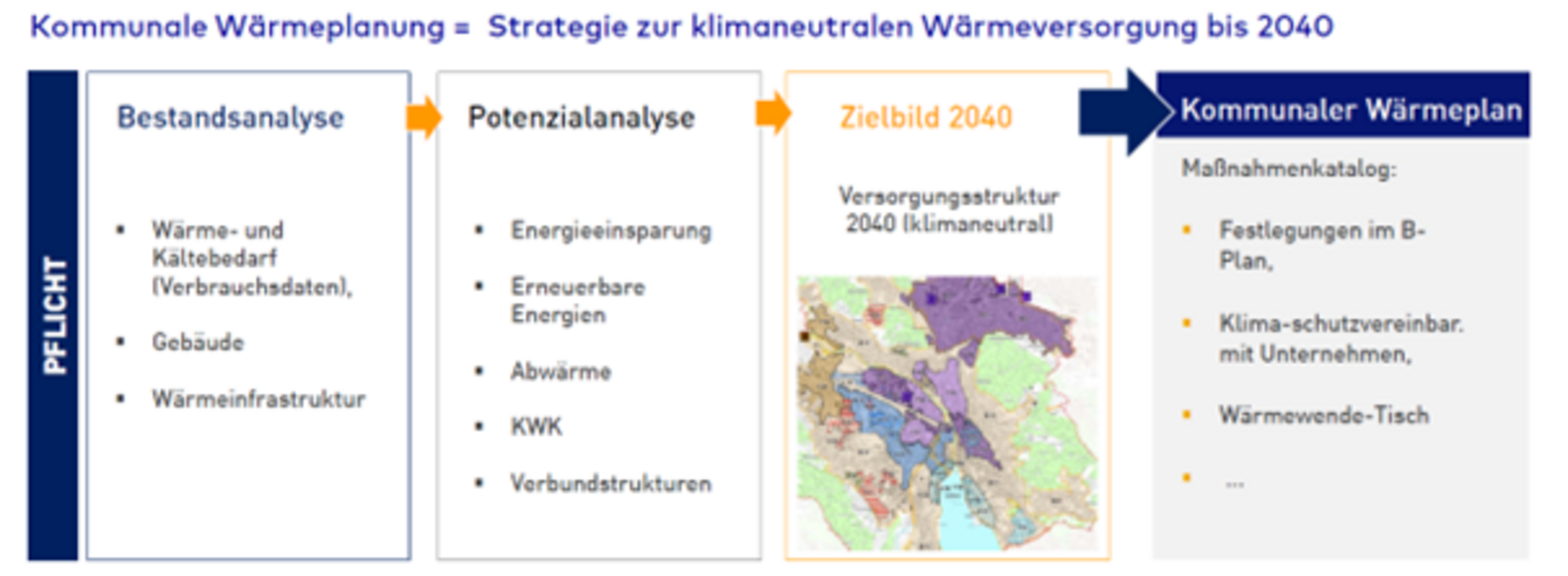 Im Jahr 2024 wurde vom Bund das Wärmeplanungsgesetz erlassen. Dieses Gesetz verpflichtet nun alle Gemeinden unabhängig von deren Einwohnerzahl, nicht nur die Stadtkreise und Großen Kreisstädte, zur Wärmeplanung. Für Gemeinden bis zu 100.000 Einwohnern sind die Wärmepläne bis spätestens 30. Juni 2028 zu erstellen.