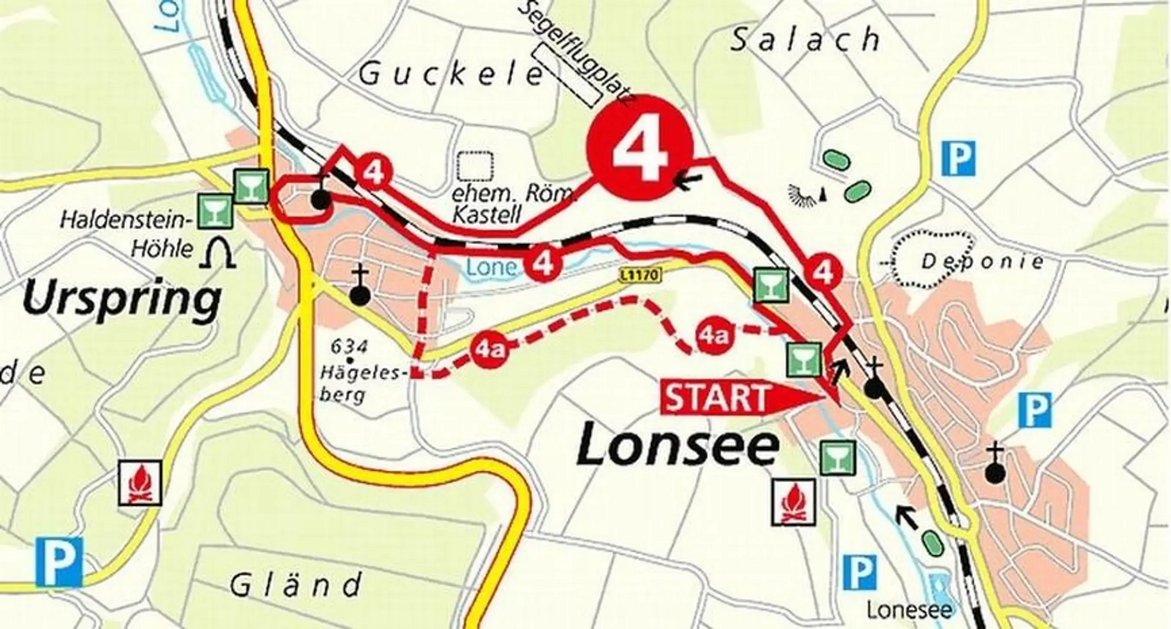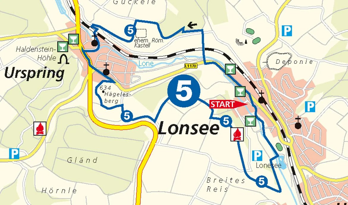 Wir wandern los zum Hägelesberg und ins Naturschutzgebiet Heiden. Von dort gehen wir hinunter zum Lonesee, eine Freizeitoase mit Wassererlebnisbereich für Familien und Kinder. Der Weiterweg führt an der Lone entlang nach Lonsee und leitet uns danach durch einen kleinen Eisenbahntunnel auf die andere Seite. Am Waldrand entlang kommen wir auf eine Bergkuppe und zum Standort des ehemaligen Römerkastells "Ad Lunam", das nur noch durch seine wallartige Außenbegrenzung und Heckenbepflanzung erkennbar ist. Danach geht es bergab und zurück nach Urspring.