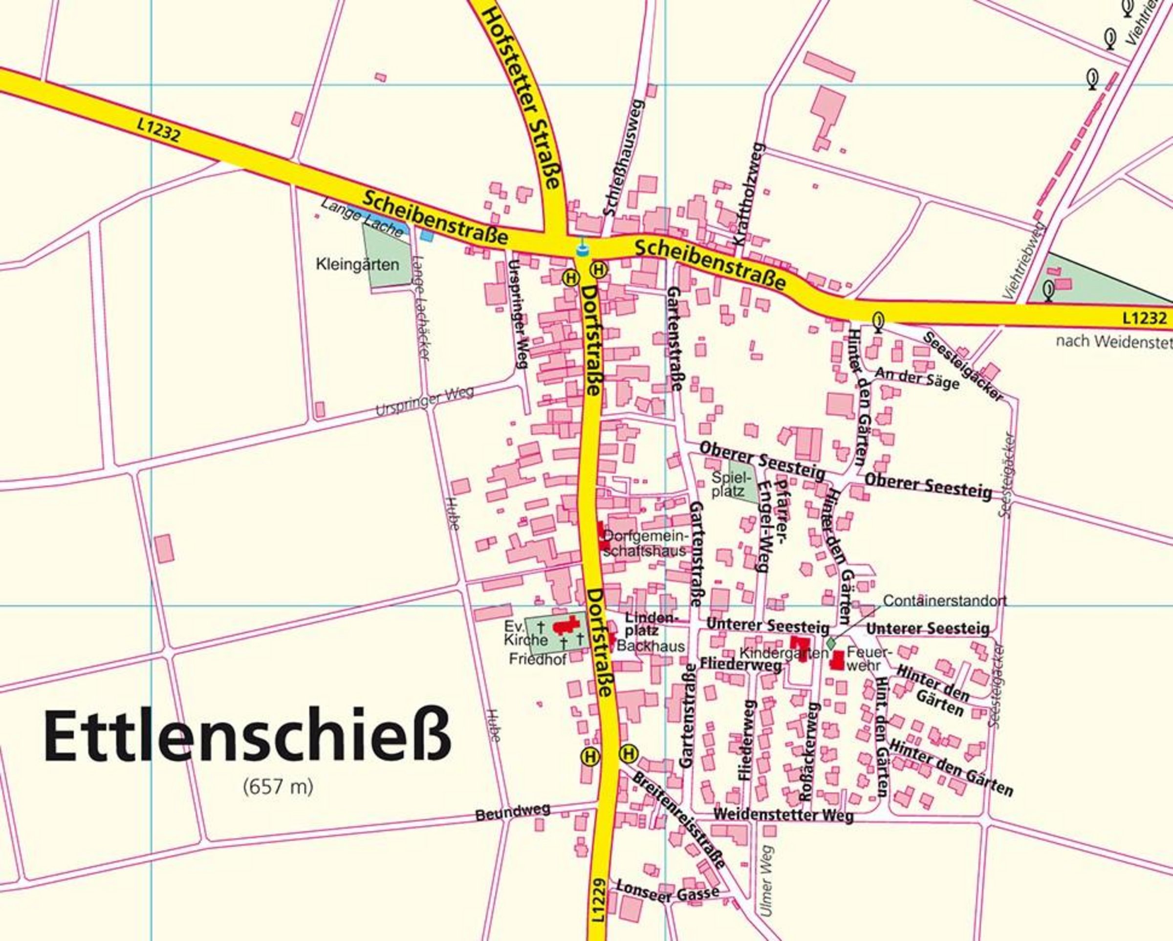 Die Landstraßen Nr. 1229 und Nr. 1232 kreuzen sich in Ettlenschieß.