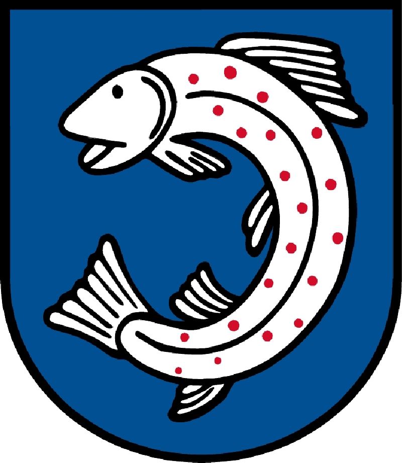 In Blau eine kreisförmig gekrümmte, mit dem Kopf nach heraldisch rechts schnellende, rotgepunktete silberne Forelle.